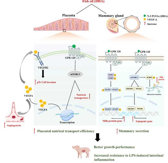 该研究首次系统阐明了在妊娠晚期和哺乳期,母体补充鱼油通过GPR120信号通路,增强胎盘的营养物质运输及乳腺的泌乳功能,从而促进后代的生长发育。研究团队在体内模型中评估了n-3 PUFAs补充对母体胎盘血管生成、营养物质运输及乳腺分泌的影响,并通过胎盘滋养层细胞和乳腺上皮细胞的体外实验,进一步验证了二十二碳六烯酸(DHA)在调控胎盘与乳腺功能中的关键作用。