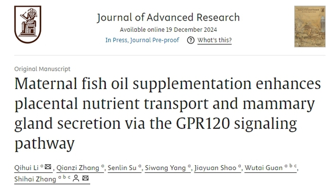 近日,乐竞在线注册动物科学学院管武太/张世海团队在《Journal of Advanced Research》(中科院一区,影响因子11.4)上在线发表了题为Maternal fish oil supplementation enhances placental nutrient transport and mammary gland secretion via the GPR120 signaling pathway的研究论文。