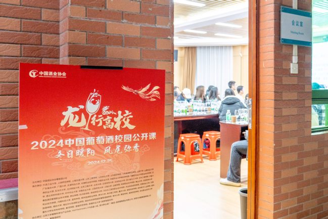 “这款是干红,大家先闻下味道,再透过光看看它的颜色。”“仔细品尝一下不同的酒,能感受到其中的口感和差异吗?”“别一口气喝完,留点在杯中感受酒的香气。”……12月25日晚,一场别致的葡萄酒公开课在华农食品学院举行。这也是“龙行高校”2024中国葡萄酒校园公开课活动的收官之课,北京大学、上海交通大学、中国农业大学、华中农业大学等全国62所高校师生以线上方式同步参与。北京大学葡萄科学与产业协会会长吴涔洋、中国酒业协会葡萄酒分会秘书长火兴三出席活动。