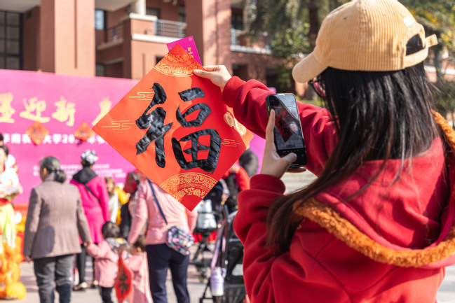 植物保护学院研究生陈同学向记者现场展示了自己刚领到的春联,其中一联写着“和顺一门生百福”。她表示,自己会把春联张贴到实验室门口,寓意未来一年和和顺顺、福气满满。