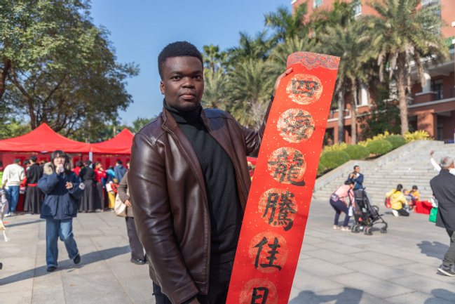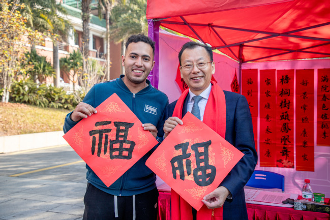 “马上要放假回国了,我想把象征着中华传统文化的‘福’也带给妈妈一份!”来自摩洛哥的留学生陶菲克今天一早便赶来现场,除了领到一幅书法家所写的“福”字外,他还在现场第一次用毛笔写下“福”,亲身感受中国书法文化的魅力。他表示,学校举办了许多中国传统文化主题活动,自己只要有空就一定会来。“华农是一个特别美的校园,对我们留学生也特别友好。我想祝我的老师和同学们新年快乐,万事顺利!”