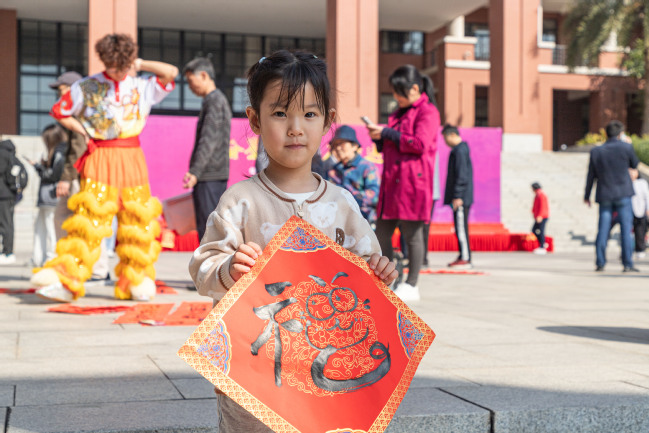 “大小论文篇篇中 学术财路两开花”“要乜有乜乜都有 想点就点点都得”……在现场,还有不少别出心裁的“花式”趣味春联惹人会心一笑。“福”字的右半边,横平竖直的笔画被大眼睛、圆滚滚的“金蛇”代替,模样憨态可掬,颇受同学和小朋友欢迎。