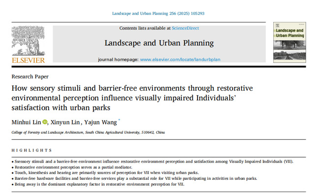 1月1日,林学与风景园林学院林敏慧教授团队在Landscape and Urban Planning期刊(中科院一区TOP期刊,影响因子8.7)上在线发表了题为“How sensory stimuli and barrier-free environments through restorative environmental perception influence visually impaired Individuals’ satisfaction with urban parks”的研究论文。该研究探讨了感官刺激和无障碍环境,与视障群体在城市公园的恢复性环境感知和满意度的关系。