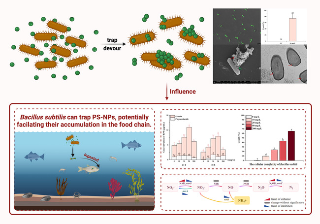“Bacillus subtilis, a promising bacterial candidate for trapping nanoplastics during water treatment”和“Pseudomonas Stutzeri may alter the environmental fate of polystyrene nanoplastics by trapping them with increasing extracellular polymers”的研究论文,致力于探究PS-NPs与益生菌之间的相互作用,分别揭示施氏假单胞菌与枯草芽孢杆菌对 PS-NPs 的影响及其在不同浓度的 PS-NPs 胁迫下产生的毒理学效应。暴露于 PS-NPs 会抑制细菌的生长和反硝化相关基因的表达,但不会影响反硝化酶的活性。在PS-NPs的胁迫下,益生菌仍可以处理水中的含氮化合物。通过共聚焦激光扫描显微镜(LCSM)、扫描电镜(SEM)和透射电镜(TEM)观察,证实了PS-NPs在暴露于益生菌时会被其胞外聚合物捕获,此时,原本分布在水体中的PS-NPs被捕获后滞留于益生菌细胞壁上或体内, PS-NPs的环境状态被益生菌改变。这种特性使得益生菌不仅可以处理废水中含氮化合物还可以通过沉降处理废水中的NPs颗粒。