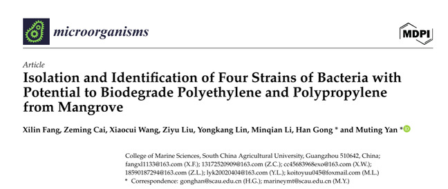 “Isolation and Identification of Four Strains of Bacteria with Potential to Biodegrade Polyethylene and Polypropylenefrom Mangrove ”的研究从红树林环境中分离、鉴定出四株具有降解聚乙烯(PE)和聚丙烯(PP)微塑料潜力的细菌菌株,分别是Pseudomonas sp. 菌株GIA7、Bacillus cereus菌株GIA17、Acinetobacter sp. 菌株GIB8和Bacillus cereus菌株GIB10。该研究发现,这些细菌对微塑料的降解率随时间增长而逐渐提高,尤其在弱酸环境下降解效率更高。此外,适量添加Mg2+和K+有利于提高降解率,而高盐浓度则抑制了微塑料的生物降解。通过扫描电子显微镜(SEM)、原子力显微镜(AFM)和傅里叶变换红外光谱(FTIR)等技术,研究人员观察到候选细菌引起的PP和PE微塑料的降解和表面变化,这可能依赖于与生物降解相关的酶,例如漆酶和脂酶,研究结果表明,这些细菌菌株可能有助于红树林环境中微塑料的生物降解。该研究为生物降解PE和PP微塑料提供了潜在的候选菌株,为减少生态系统中的“白色污染”提供了新的思路。未来的研究可以进一步筛选其他塑料类型(如PET)的降解菌株,并优化塑料降解在实践中的应用,为实现绿色、环保、可持续发展道路提供新方向。
