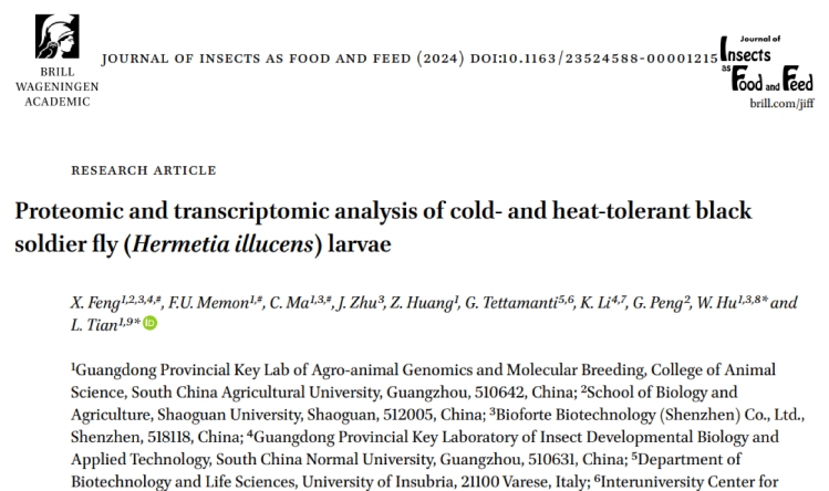此前,团队已收集、建立了黑水虻种质资源库。以优势株(生物源株)在16℃和40℃下进行连续11代的高/低温选育,获得了相较于对照组更耐低温或高温的品系,其幼虫体重和干物质转化率显著提高。团队进一步利用RNA-seq、全长转录组测序和蛋白组测序对上述耐高/低温黑水虻差异表达基因和蛋白进行深入分析,并探讨了选育后的黑水虻耐高、低温的分子基础。以上成果论文第一作者为冯兴暴博士后,田铃教授和胡文锋副教授为论文通讯作者。