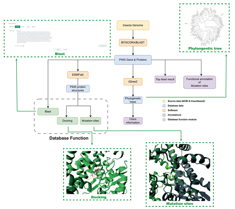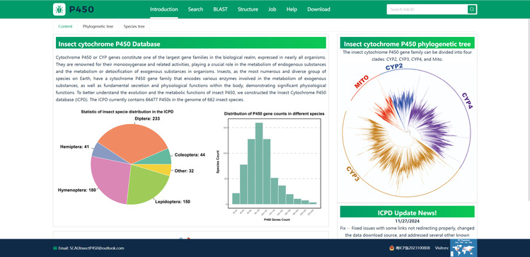 随着测序技术的发展和成本的降低,越来越多的昆虫完成了全基因组测序,发现了大量的P450基因。然而,这些P450基因的数据缺乏统一的格式标准以及深度的信息挖掘。本研究从682种昆虫的高质量基因组中识别出P450基因家族。通过对这些重新识别的P450基因进行注释、系统发育分析和结构解析,研究团队构建了昆虫细胞色素P450数据库(ICPD),提供关于昆虫P450多样性和结构特征的综合数据。此外,ICPD支持蛋白质结构的交互式可视化,以及分子对接、突变蛋白结构预测和蛋白质结构相似性计算等服务。