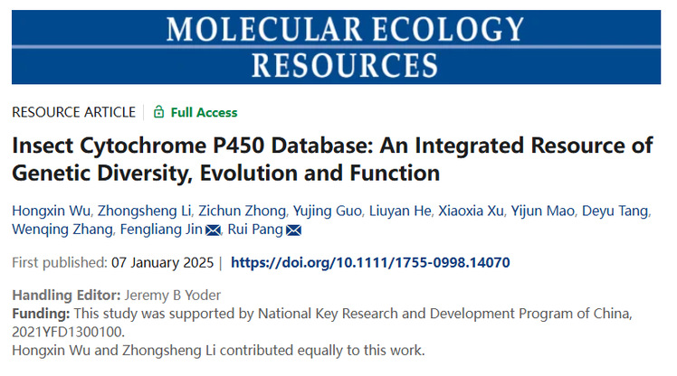 近日,植物保护学院/绿色农药全国重点实验室金丰良/庞锐团队在国际知名学术期刊“Molecular Ecology Resources”(中科院一区Top,IF5year = 7.8)上在线发表了题为“Insect Cytochrome P450 Database: An Integrated Resource of Genetic Diversity, Evolution and Function”的研究论文。该研究通过广泛收集和分析昆虫基因数据,构建了目前昆虫学领域最为广泛、全面且标准化的综合昆虫解毒代谢核心基因细胞色素P450信息平台。这为昆虫抗药性的形成与适应性进化研究提供了重要资源。