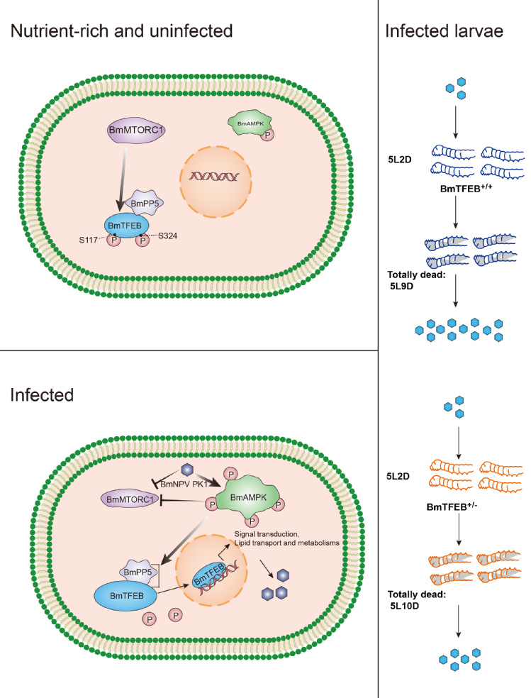研究结果显示,相比与对照遗传背景为BmTFEB+/-的家蚕幼虫在BmNPV病毒感染后显示出更强的抗病毒能力,其死亡的时间得到延长。这些研究揭示了宿主与病毒之间的一种新型相互作用,为害虫的生物防控及益虫的病原防控提供了新的靶点,为开发新的家蚕抗病毒病策略提供了理论基础。