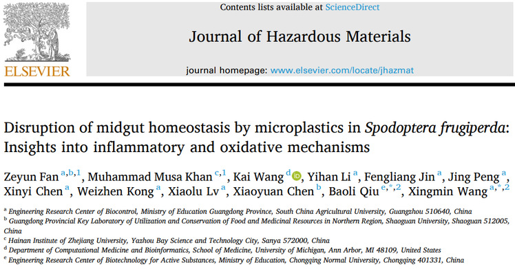 近日,乐竞在线注册植物保护学院生物防治团队王兴民教授课题组和重庆师范大学生命科学学院邱宝利教授课题组合作,在微塑料对草地贪夜蛾中肠损伤的机制研究上取得研究进展,相关论文发表在学术期刊《Journal of Hazardous Materials》(中科院一区Top期刊,影响因子12.2)。