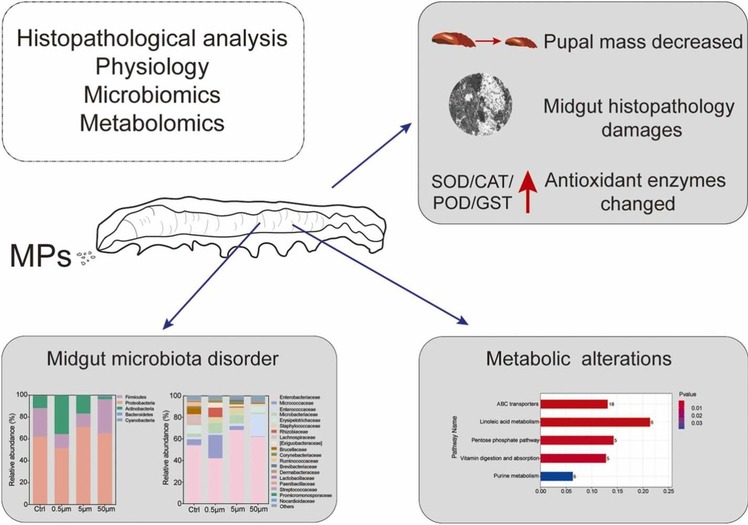 微塑料作为一种广泛存在的环境污染物,因其持久性和生物积累特性,已成为全球关注的环境问题。近年来,微塑料的研究主要集中在海洋、湖泊及河流等环境中的影响,而微塑料在农业生态系统的研究,特别是其对生态的影响研究不足。为了探究微塑料对农业生态系统生物的影响,本研究以草地贪夜蛾为研究对象,利用组织病理学、生理学、16S及代谢组等技术,研究了聚乙烯(PE)微塑料对草地贪夜蛾生长发育的影响及机制。