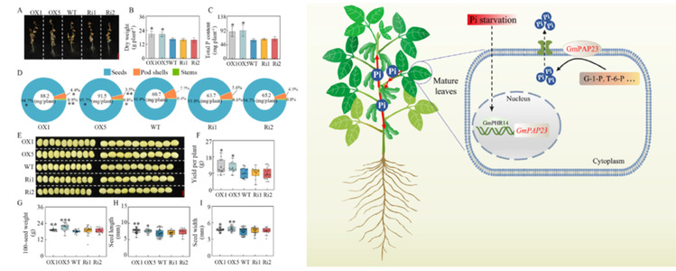 促进内源磷再利用对于提高植物磷效率至关重要,植物内部磷的再利用主要包括液泡磷的输出、有机磷的水解以及将磷从衰老器官运输到幼嫩器官等,植物体内有机磷水解的分子调控机制一直是植物营养的热点研究问题。本研究鉴定了受低磷胁迫上调表达的大豆紫色酸性磷酸酶基因GmPAP23。对其功能解析发现,超量表达GmPAP23的大豆植株成熟叶片和豆壳中磷的比例明显降低,而种子中磷的比例明显增加。结合酶学、亚细胞定位和代谢组学分析,明确了GmPAP23能够水解叶片葡萄糖-1-磷酸和海藻糖-6-磷酸等磷酸酯类,参与大豆内部磷再循环和分配的功能。此外,研究证明了大豆转录因子,GmPHR14,可以直接调控GmPAP23的表达,并建立了GmPHR14-GmPAP23调控大豆内部磷再循环的新途径,为进一步提高大豆磷利用效率和产量提供了重要的候选基因和材料。