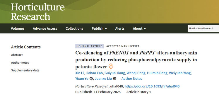近日,园艺学院余义勋教授课题组在国际著名期刊Horticulture Research(中科院一区Top)上在线发表了题为“Co-silencing of PhENO1 and PhPPT alters anthocyanin production by reducing phosphoenolpyruvate supply in petunia flower”的研究论文。