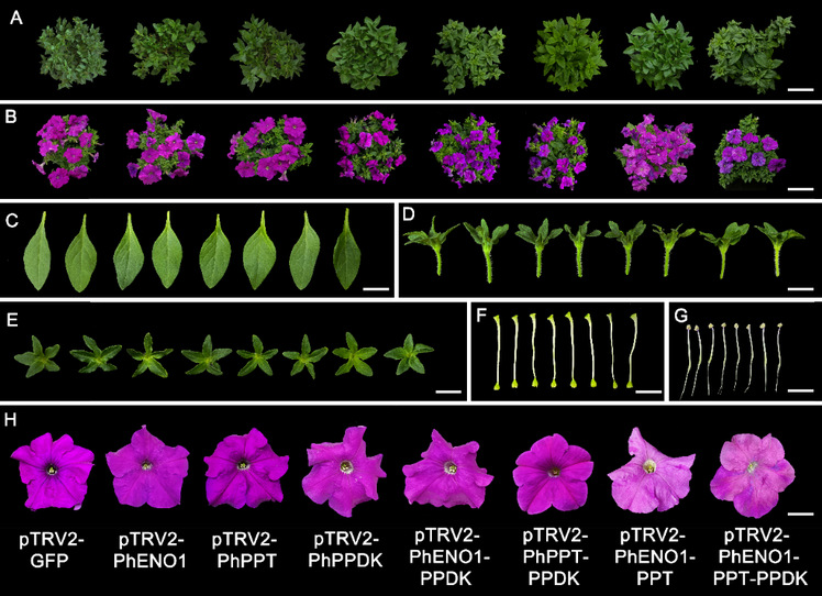 该研究发现,单独沉默PhENO1、PhPPT或PhPPDK或者是共同沉默PhENO1和PhPPDK或PhPPT和PPDK均未引起矮牵牛的表型发生变化。仅当PhENO1与PhPPT共同沉默时,矮牵牛花色显著变浅,花青素含量显著下降,PEP水平显著下降了52%,莽草酸、类黄酮、芳香族氨基酸等代谢物同步下降,但花青素合成相关的关键基因表达量未受影响。研究还发现三重沉默PhENO1/PhPPT/PhPPDK的植株表型与共同沉默PhENO1和PhPPT表型一致。另基于荧光蛋白标记实验显示PhENO1与PhPPT蛋白分别定位于质体基质和膜系统,从而最终确定质体中PEP主要来源于质体内部ENO1催化生成和PPT介导的跨膜运输,而并非是PhPPDK催化生成。该研究结果为花色分子育种提供了新路径。