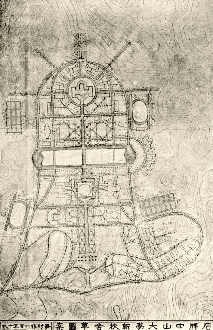据1930年石牌中山大学新校舍草图案可以看出,著名建筑师吕彦直参与、杨锡宗主持完成的道路规划形似“钟”形,此两座建筑处于钟形的顶部,居于中轴线北端, 既有辟雍的寓意所在,又体现“以农为本”的重农思想。