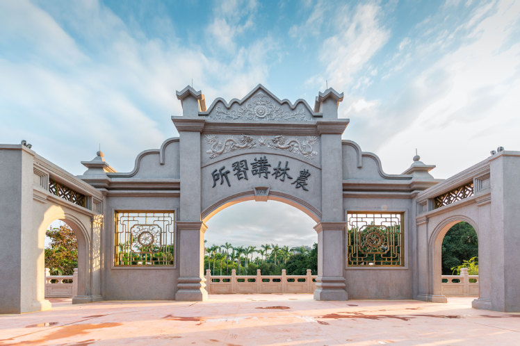 1909年广东全省农事试验场及附设农业讲习所创办,随着岁月的流逝,原有的门楼已不复存在,仅留下珍贵的历史图像。在广大校友的热情提议下和慷慨捐赠下,学校于2024年在洪泽湖西侧复建了农林讲习所门楼,门楼高8.1米,宽19.7米,采用民国时期的水刷石、水磨石等传统工艺,并巧妙融入当代建筑创新技术,成为校园历史文化建筑又一热门打卡点。