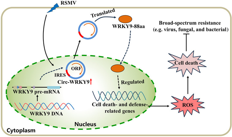 该研究通过环状RNA测序和分子生物学等技术鉴定到一个由水稻基因OsWRKY9通过未知环化机制形成的环状RNA(命名为circ-WRKY9),该分子在感染水稻条纹花叶病毒(RSMV)的水稻中上调表达。进一步实验证实,circ-WRKY9可编码含88个氨基酸(aa)的新型多肽(命名为WRKY9-88aa)。这是植物环状RNA编码蛋白的首次发现。