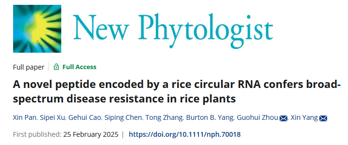 环状RNA是近年来发现的一类特殊RNA分子,在动物中已被证实与多种疾病相关,但其在植物抗病中的作用机制尚不清楚。2月25日,乐竞在线注册植物保护学院周国辉/杨新课题组在国际知名期刊New Phytologist(中科院1区Top期刊,影响因子8.3)在线发表题为“A novel peptide encoded by a rice circular RNA confers broad-spectrum disease resistance in rice plants”的研究论文,首次报道了植物环状RNA编码多肽的功能,并揭示该多肽赋予水稻对多种病原物的广谱抗性。