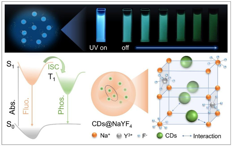 碳点(CDs)作为一种新兴的碳基发光材料,近年来在发光领域备受瞩目,其室温磷光(RTP)现象更是吸引了众多研究者的关注。然而,由于溶解氧和溶剂分子强烈的猝灭效应,往往会导致三重态激子的非辐射跃迁增强,这使得在溶液中实现高效稳定的CDs基室温磷光发射面临诸多挑战。过往研究显示,宿主基质提供的刚性环境可以抑制分子的振动并减少非辐射弛豫,从而增强三重态激子的辐射跃迁。同时,刚性基质可以将CDs与氧气、溶剂分子隔离开,从而避免三重态激子猝灭。尽管如此,目前大多数通过基质辅助方法制备的CDs基磷光材料仅能在固态下发射出磷光,而在水等溶液中往往观察不到磷光现象。究其原因,一方面,部分基质易溶于水,或者过量的水会破坏基质与CDs之间的相互作用,从而导致磷光的猝灭;另一方面,一些基质颗粒尺寸过大,难以在溶液中均匀分散。鉴于此,本研究通过一步高温共沉淀法,将柠檬酸盐衍生的CDs封装到NaYF4纳米晶中,成功实现了CDs在溶液中的室温磷光发射。