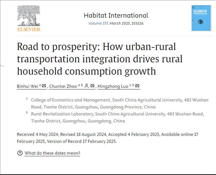 近日,经济管理学院罗明忠教授课题组连续在国际知名学术期刊上发表研究论文。其中,Road to prosperity: How urban-rural transportation integration drives rural household consumption growth一文发表在国际知名期刊Habitat International(中科院经济学1区,JCR Q1)。