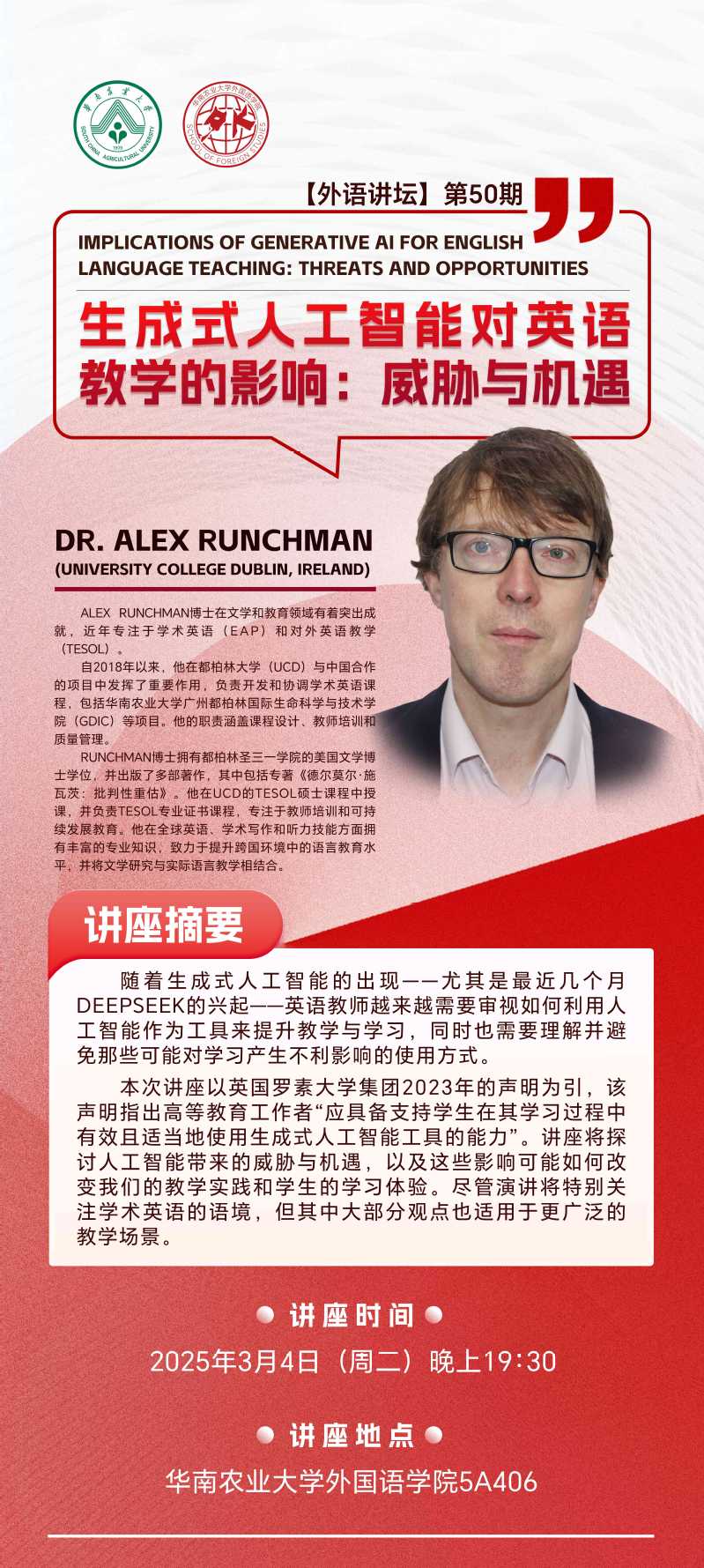 【外语讲坛】第50期 生成式人工智能对英语教学的影响:威胁与机遇
