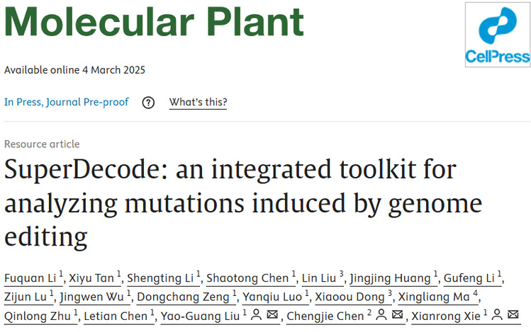 近日,农学院刘耀光/谢先荣团队在Molecular Plant发表了题为“SuperDecode: an integrated toolkit for analyzing mutations induced by genome editing”的研究论文。该论文报道了基于Sanger测序、二代测序和三代测序技术对各种基因编辑样品的不同类型突变进行高效检测的方法和分析工具箱SuperDecode。