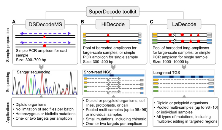 为满足科研人员在不同应用场景下的检测需求,研究团队开发了一个全面、综合的基因编辑突变分析工具箱SuperDecode,可以实现对利用不同测序平台产生的数据进行高效分析,并且开发了基于PCR构建多样本混合文库的方法。SuperDecode包含3个子软件模块:DSDecodeMS、HiDecode以及LaDecode,分别对应Sanger测序、二代测序结果以及三代测序数据的解码分析。其中,DSDecodeMS是研究团队此前开发的网页版工具DSDecod/DSDecodeM的升级本地版,添加了去除Sanger测序两端低质量序列的功能,同时解除了Sanger测序峰图上传数量的限制,通过直接读取靶点扩增子的Sanger测序峰图,分析样本的突变类型。HiDecode能对添加特定barcode序列的多样本混合文库的二代测序文件进行解码,实现多种类型样本的高通量突变分析,包括二倍体、多倍体、细胞系等。同时,HiDecode中提供了96×96种特异性barcode序列,理论上可一次性检测多达9,216个样本的突变类型。LaDecode则是基于单分子测序技术,对大片段的PCR扩增子进行高通量解码分析的软件,利用三代测序技术序列读长较长的优势,LaDecode能够识别目的区域中的各种复杂的突变,并区分检测样本的所有单倍型,该工具特别适用于分析启动子区域饱和突变和平铺删除引起的结构变异。