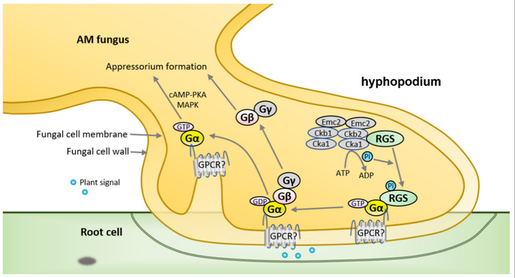 基于研究结果和基因组学分析,作者提出了AM真菌G蛋白信号组分调控附着足形成的工作模型(如图2所示)。