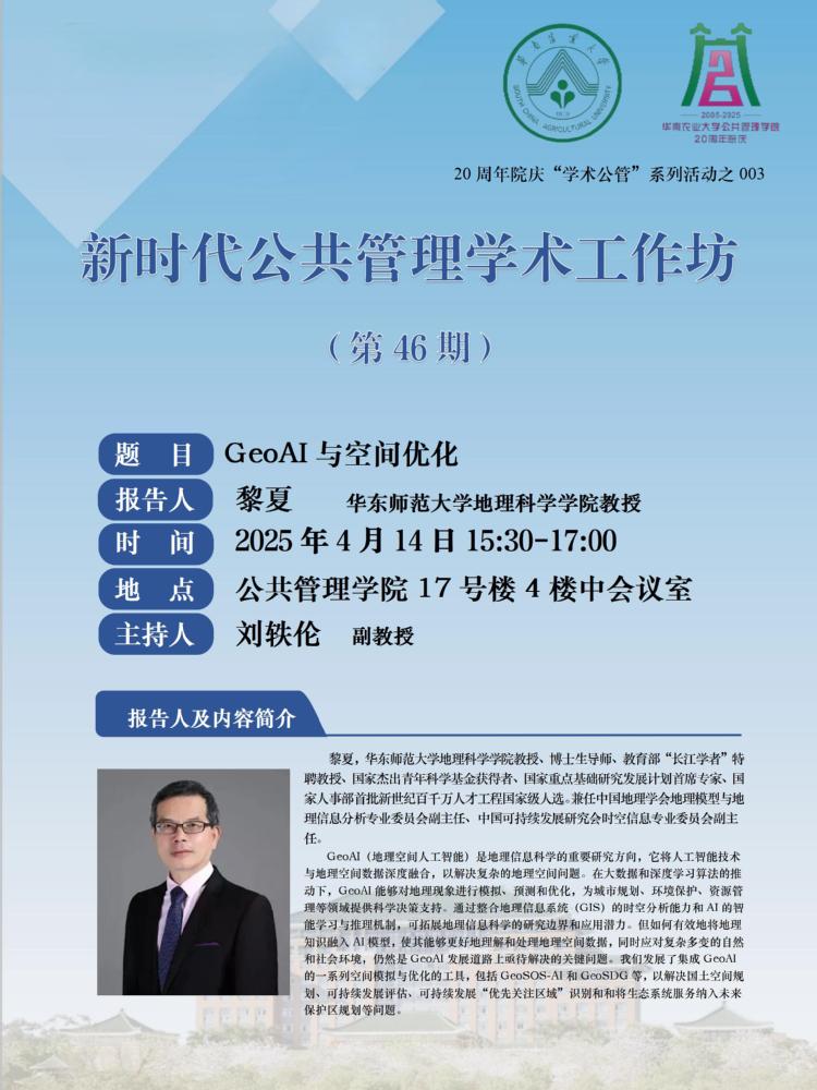 公共管理学院20周年院庆“学术公管”系列活动之003:新时代公共管理学术工作坊(第46期):GeoAI与空间优化