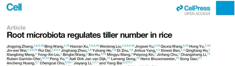 4月22日,中国科学院遗传与发育生物学研究所白洋研究员(现任北京大学研究员)、崖州湾国家实验室/中国科学院遗传与发育生物学研究所李家洋院士、乐竞在线注册农学院储成才教授、南方科技大学黄安诚研究员、中山大学肿瘤防治中心高嵩研究员带领的五个顶尖科研团队联合攻关在Cell发表了题为Root microbiota regulates tiller number in rice的重磅研究成果。该研究通过整合微生物组学、分子生物学、作物遗传学、天然产物化学及结构生物学等技术,首次系统揭示了根际微生物组调控水稻分蘖的功能与分子机制,成为植物-根际微生物互作研究的范例。