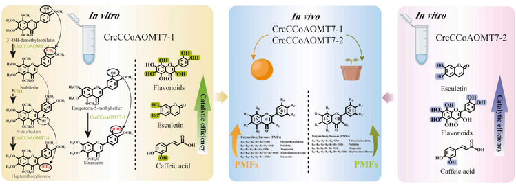 PMFs作为一类具有显著抗癌活性的植物次生代谢产物,受到广泛关注。柑橘果皮特异性积累丰富的PMFs,甲基化修饰是PMFs生物合成的关键步骤。然而,目前报道的柑橘中O-甲基转移酶(OMT)的功能不足以阐明PMFs的完整甲基化过程。该研究在团队发表的茶枝柑基因组和黄酮代谢通路基础上(Wen et al. 2024,Nature Communications),进一步通过比较分析茶枝柑( Citrus reticulata ‘Chachiensis’ )果实不同发育阶段PMFs的积累规律与OMTs基因的表达模式,从柑橘中鉴定了两个全新的属于 CCoAOMT-like 亚组的咖啡酰辅酶A O-甲基转移酶(命名为CrcCCoAOMT7-1/7-2)。通过体外酶功能分析表明,CrcCCoAOMT7-1显示出对黄酮底物强烈偏好,可催化邻羟基类黄酮的3、6、8 、3' 和4' 位 ;而CrcCCoAOMT7-2则更倾向于催化槲皮素和黄烷酮底物,甲基化邻羟基类黄酮的 6、7、8 、3' 和4'位。此外,体外实验直接证明CrcCCoAOMT7-1催化合成了抗癌活性成分川陈皮素、甜橙黄酮和七甲氧基黄酮,为CCoAOMT家族中首个被证实具备该功能的酶。进一步通过瞬时过表达和VIGS,验证了CrcCCoAOMT7-1/7-2可以促进柑橘体内PMFs的积累。该研究证明CrcCCoAOMT7-1/7-2是一种高效的多功能O-甲基转移酶,参与柑橘中PMFs的生物合成。研究结果为完善柑橘 PMFs 的生物合成途径提供了新的资料,并对进一步提高茶枝柑的药用价值以及通过酶促工程合成天然抗癌活性物质具有重要生物学意义。