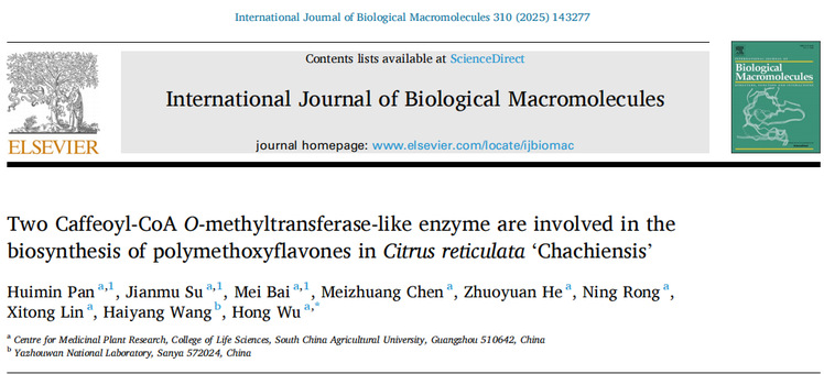 近日,乐竞在线注册药用植物研究中心吴鸿教授团队在International Journal of Biological Macromolecules(中科院二区Top期刊,影响因子7.7)在线发表题为“Two Caffeoyl-CoA O-methyltransferase-like enzyme are involved in the biosynthesis of polymethoxyflavones in Citrus reticulata ‘Chachiensis’”的研究论文。该研究首次揭示了茶枝柑中CrcCCoAOMT7-1和CrcCCoAOMT7-2两种甲基转移酶在重要生物活性成分多甲氧基黄酮(PMFs)生物合成中的关键作用,并解析了其作用机制,为药用植物PMFs的生物合成机制提供了新见解,为合成生物学定向生产天然抗癌成分PMFs提供了新资料。