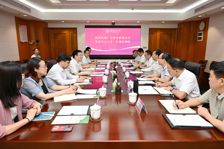 王兵介绍了广东技术师范大学的办学历程与发展情况。他谈到,广师大正积极谋划“十五五”发展规划,全力推进“申博冲百”目标,并即将迎来办学70周年。希望以此次交流为契机,学习华农在学科建设、队伍建设、人才培养、文化建设等方面的优秀经验做法,深化两校合作交流,实现优势互补、合作共赢,推动双方高质量发展。