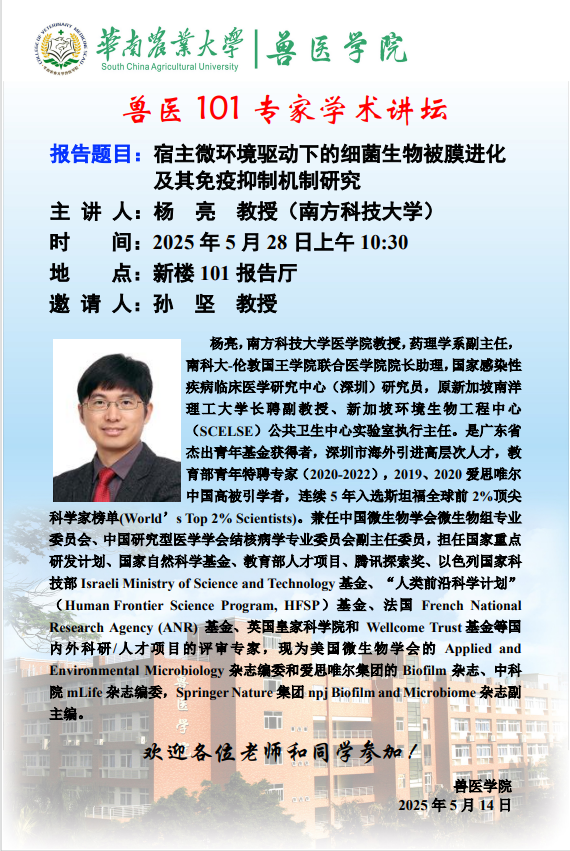 兽医101著名专家学术讲坛:宿主微环境驱动下的细菌生物被膜进化及其免疫抑制机制研究
