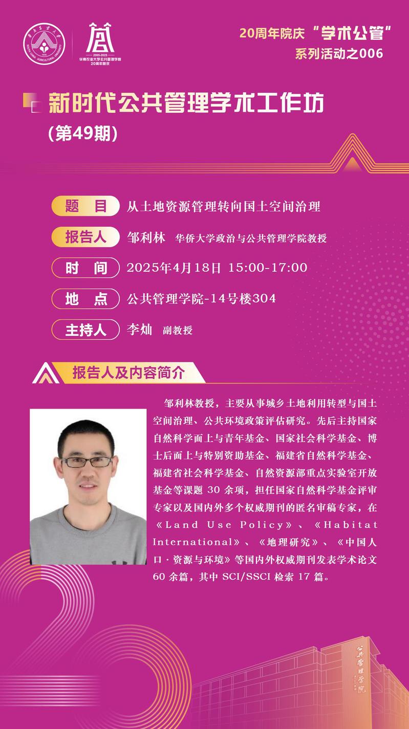 公共管理学院20周年院庆“学术公管”系列活动之006:新时代公共管理学术工作坊(第49期):从土地资源管理转向国土空间治理