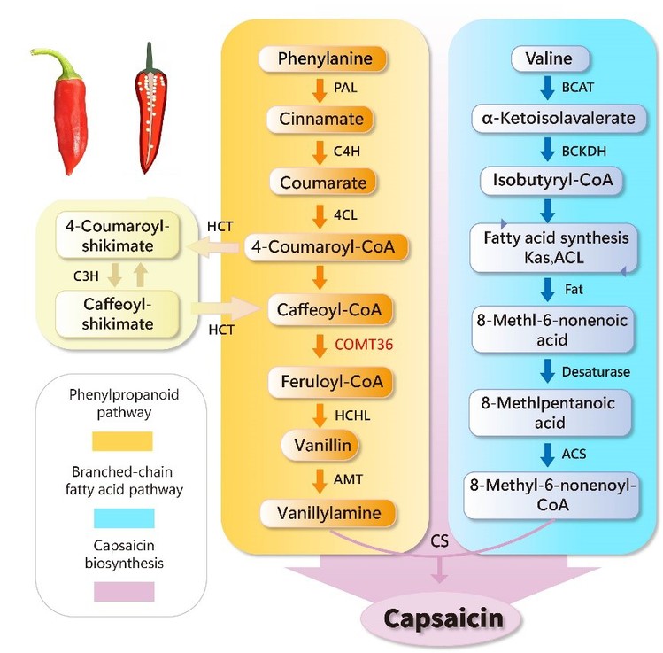 本研究通过全基因组分析鉴定到58个OMT基因,其染色体分布不均匀且频繁的串联重复事件驱动了基因家族扩张。系统发育与保守基序分析将其划分为咖啡酰辅酶A O-甲基转移酶(CCoAOMT)和咖啡酸O-甲基转移酶(COMT)两个亚家族。组织差异表达模式及启动子顺式作用元件变异分析揭示该基因家族其功能发生分化。值得注意的是,本研究发现此前功能未知的COMT36可能是编码辣椒素生物合成通路甲基转移酶的关键基因,基于时空特异性及不同基因型表达分析发现COMT36表达模式和辣椒素积累特征的高度一致,系列实验证实CaCOMT36参与辣椒素类物质的生物合成。上述研究完善了辣椒素生物合成通路,为辣椒风味遗传改良提供了相关基因资源。