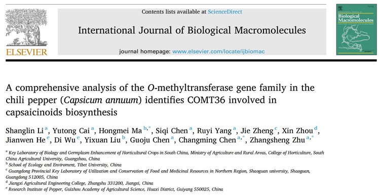 近日,园艺学院辣椒研究团队朱张生副教授等人指导本科生在SCI学术期刊International Journal of Biological Macromolecules(中科院二区Top期刊,影响因子7.7)在线发表了A comprehensive analysis of the O-methyltransferase gene family in the chili pepper (Capsicum annuum) identifies COMT36 involved in capsaicinoids biosynthesis学术论文,揭示COMT36基因编码甲基转移酶参与辣椒素合成。
