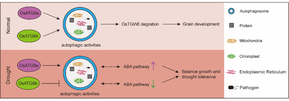 OsATG9a和OsATG9b调控水稻生长与抗旱机制模式图