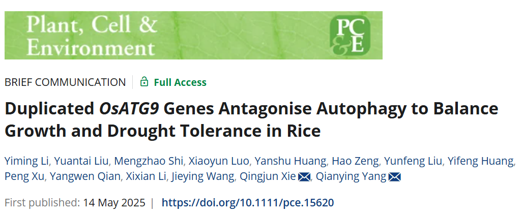 近日,乐竞在线注册农学院谢庆军课题组在中科院一区Top期刊Plant,Cell & Environment (IF5-year=7.6)在线发表了题为“Duplicated OsATG9 Genes Antagonise Autophagy to Balance Growth and Drought Tolerance in Rice”的研究论文。文章报道了OsATG9a和OsATG9b基因通过拮抗自噬平衡水稻生长与抗旱性,为水稻生长和抗性协同改良提供了新见解。