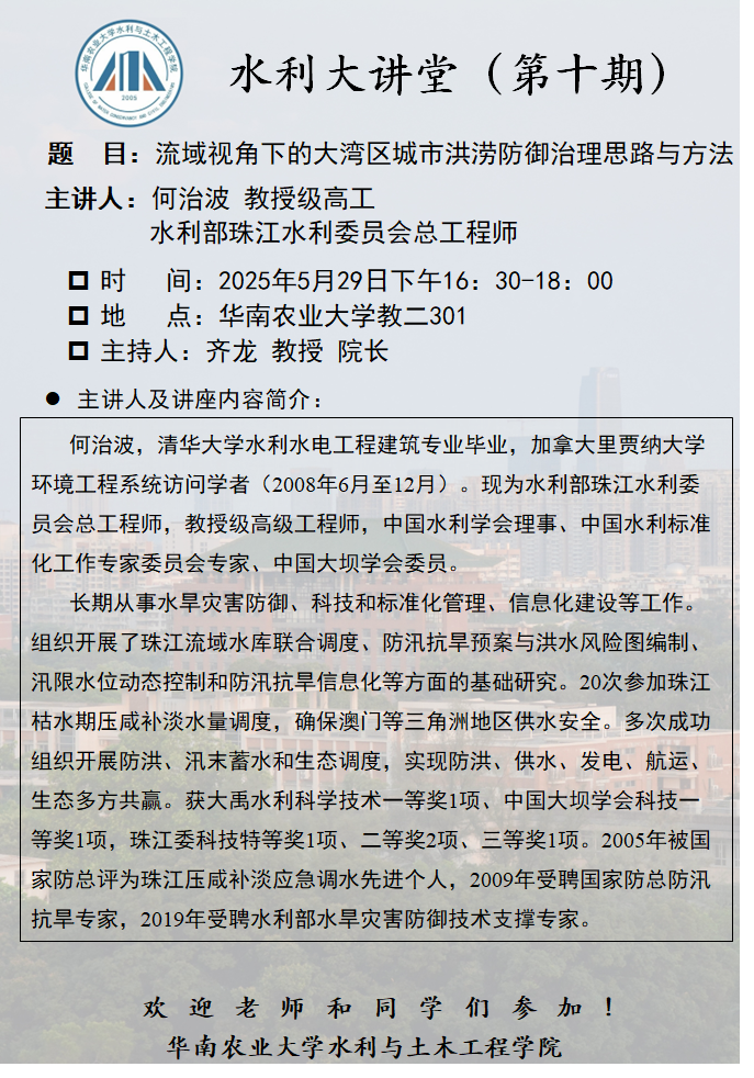 水利大讲堂(第10期):流域视角下的大湾区城市洪涝防御治理思路与方法