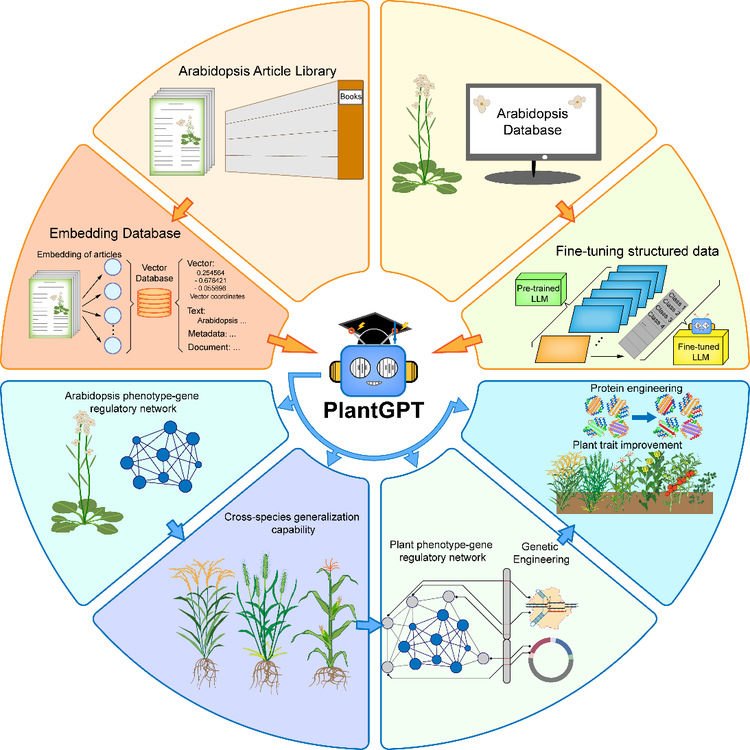 该研究通过结合检索增强生成(RAG)技术和大语言模型(LLM)微调,建立了包含超过60,000篇植物研究文章摘要的向量数据库,使用13,993个拟南芥表型和23,323个基因功能数据构建了101,000个问答对进行模型优化。相比传统的计算生物学方法,PlantGPT能够准确回答植物功能基因组学领域的专业问题,并成功克服了大语言模型在专业领域应用中的“幻觉”问题。