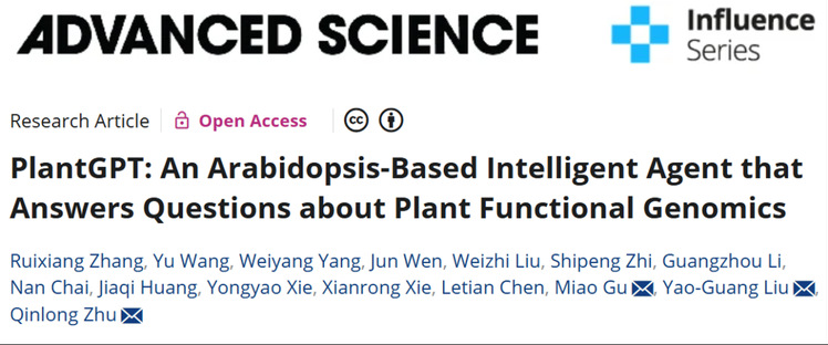近日,农学院、未来作物精准育种基础研究卓越中心、亚热带农业生物资源保护与利用国家重点实验室和岭南现代农业科学与技术广东省实验室刘耀光院士/祝钦泷研究员团队联合清华大学在国际著名期刊Advanced Science(中科院一区TOP期刊,影响因子16.3)在线发表了题为“PlantGPT: An Arabidopsis-based Intelligent Agent That Answers Questions About Plant Functional Genomics”的研究论文,并被选为Editor's Choice与Frontispiece(扉页论文)高亮推荐。该工作开发了一个以拟南芥为基础的植物功能基因组学专家问答系统PlantGPT,通过融合检索增强生成(RAG)技术和大语言模型(LLM)微调方法,实现了对植物功能基因组学专业问题的精准回答与分析,为植物科学研究领域提供了全新的人工智能辅助工具。