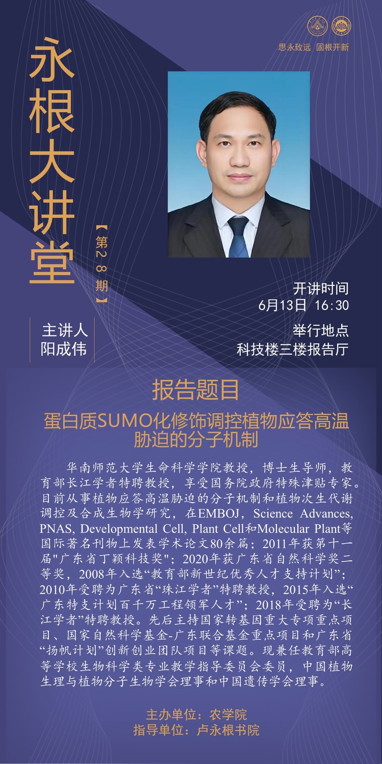 永根大讲堂第28期--蛋白质SUMO化修饰调控植物应答高温胁迫的分子机制