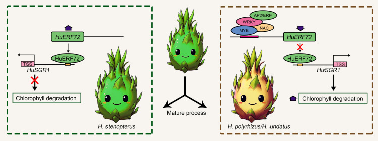 该研究用ONT、PacBio SMRT、Illumina和Hi-C四种测序技术对‘双色一号’火龙果进行了全基因组测序和组装,获得了T2T水平上具有高完整性、连续性和组装质量的火龙果基因组,同时获得了‘红花青龙’(青皮白肉)和‘大红’(红皮红肉)两个高质量火龙果基因组。基于参考基因组的比对,发现火龙果转录组中广泛存在Cactus virus X、Pitaya virus X、Schlumbergera virus X、Zygocactus virus X和Guangxi alphaflexivirus五种病毒。为了解决这一问题,我们设计了一种特异性消化火龙果中病毒转录本的寡核苷酸池,开发了一种高效、新颖和普适性强的火龙果转录本纯化系统。基于火龙果基因组中的结构变异和纯化后的高质量转录组数据,鉴定出一个与火龙果果皮叶绿素积累水平显著正相关的转录因子HuERF72,HuERF72与HuSGR1启动子之间发生相互作用,抑制HuSGR1的表达,从而使火龙果果皮叶绿素降解受阻。该研究解析了HuERF72-HuSGR1转录调控导致火龙果滞绿的调控网络,为火龙果果实颜色调控提供了重要的参考依据。
