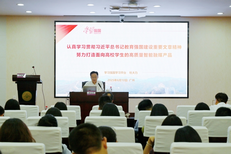 杜大力以《认真学习贯彻习近平总书记教育强国建设重要文章精神,努力打造面向高校学生的高质量智能融媒产品》为题,从“深刻认识准确把握新时代我国教育事业的定位”“生成式人工智能和大语言模型‘赋能教育和新闻领域’的多种可能性”“‘学习强国’学习平台对打造高质量智能融媒产品的有益探索”等三方面进行阐述。报告主题鲜明、内容丰富、内涵深刻,加深了与会人员对习近平总书记关于教育强国建设的一系列重要论述和重要讲话精神的理解,以及对立足高校、面向大学生开发的“同学汇”这一青年思政社交产品有了更清晰的认识,为广东高校做好互联网时代思想政治工作和意识形态工作提供了有力指导。