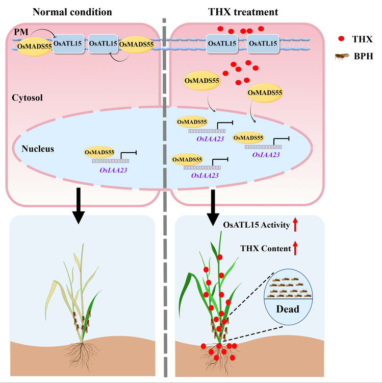 团队先前克隆了噻虫嗪高效利用吸收转运蛋白基因OsATL15并通过韧皮部特异表达该基因实现了噻虫嗪在稻飞虱为害部位的积累。然而,OsATL15如何响应噻虫嗪并协调转运网络的机制并不清楚。该论文主要揭示了转录因子OsMADS55与转运蛋白OsATL15之间的相互作用,进而提高噻虫嗪在水稻中吸收转运,增强对稻飞虱的防治效果。