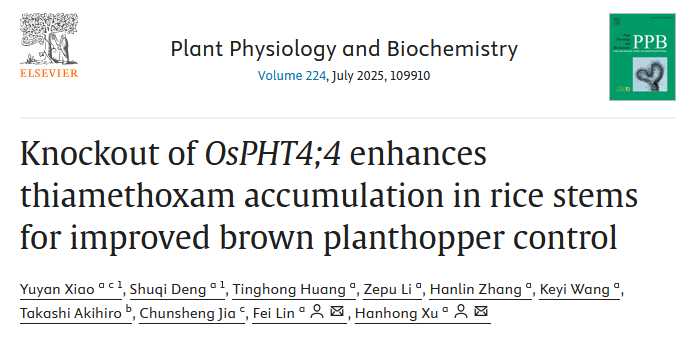 论文二:Knockout of OsPHT4;4enhances thiamethoxam accumulation in rice stems for improved brown planthopper control(Plant Physiology and Biochemistry)