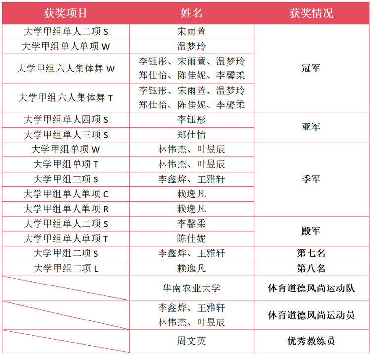 除竞技成绩外,华农体育舞蹈队还荣获“体育道德风尚运动队”称号,教练周文英获评“优秀教练员”,队员李鑫烨、王雅轩、林伟杰、叶昱辰获“体育道德风尚运动员”称号。