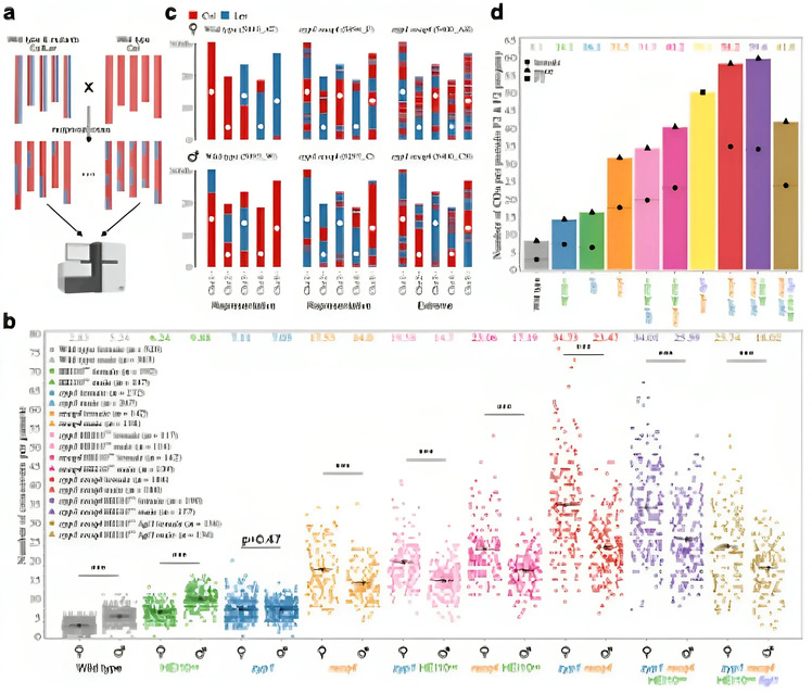 在真核生物中,减数分裂期间的交叉重组(crossover, CO)是同源染色体间遗传物质交换的核心机制,既保障染色体准确分离,又促进种群遗传多样性。然而,尽管减数分裂产生大量DNA双链断裂作为重组前体,最终形成的CO数量却受到严格限制,通常每条染色体仅1–3个,且多集中于染色体远端。此外,CO频率和分布常呈现显著的性别差异,其机制尚不明确。该限制使大片段基因组区域难以重组,阻碍了优良等位基因组合与连锁打破,是精准育种的主要瓶颈之一。