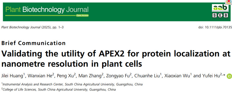 近日,测试中心显微成像分析平台与生命科学学院胡宇飞课题组合作,在Plant Biotechnology Journal(中科院1区Top期刊)发表了题为“Validating the utility of APEX2 for protein localization at nanometre resolution in plant cells”的研究论文。该研究系统评估了APEX2标签在植物蛋白质电镜亚细胞定位中的应用效果。